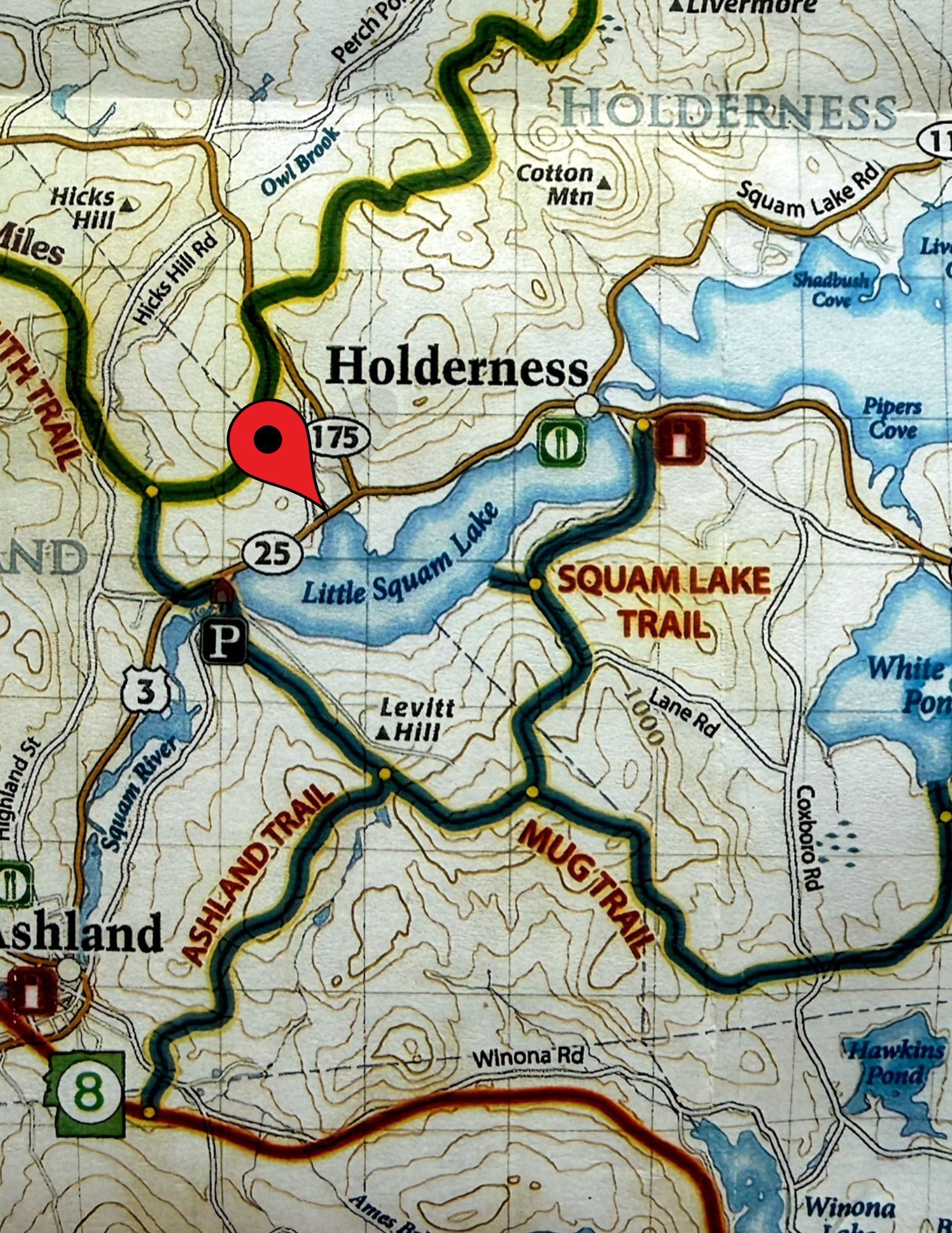 If you’d rather not cross iced-over Little Squam Lake, you can always trailer over to Ashland Town Beach and access trail P204. Go through the town campground to access Ashland, Bridgewater, Holderness and Meredith. Go over the covered bridge, across Route 3 to access Plymouth, Campton and Rumney.